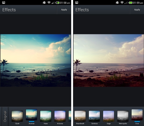 Photo editor pro for Android has lots of options and tools for editing an image. Covering all of them will make this post annoyingly long, so I will cover sticker, effects, and frames in detail as these are the options which are used the most. Tapping on the effects options will give all the effects as seen here. Like always some of these effects are good while others are too intense for my liking. Simply click on the preview strip below to see different effects.