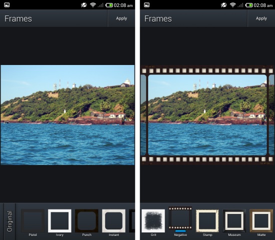 Frames also make your photo look cool. When you use the frames options you will have the interface as seen here and you can use it to apply and try out different frames for your photos. Tap on apply after you are done with each option or tool if you would like to keep the change.
