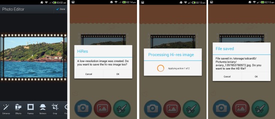 If you want to save your creations, simply click on the done button which is located on the upper right corner and your image will be saved to the device. Also Photo editor pro for Android will ask you if you would like to save the same image in higher resolution, tap on ‘OK’ if you would like to save the photo in high resolution.