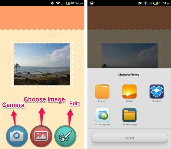 Get Photo Editor Pro for Android from the link or QR code at the end of this post. When Photo Editor Pro for Android is launched for the first time, you will have the interface as seen here which includes a randomly loaded image and three buttons in the bottom. The uses of the buttons can be seen below. Tapping on the center image will bring up random images from your device’s memory. You can also load images for editing by capturing from the camera or opening images from the gallery. When you tap on the camera button then your camera interface will come up, take a photo, and then edit it in the app. When the choose image button is tapped, then Photo Editor Pro for Android will present you with all the ways in which you can find and load images from your phone.