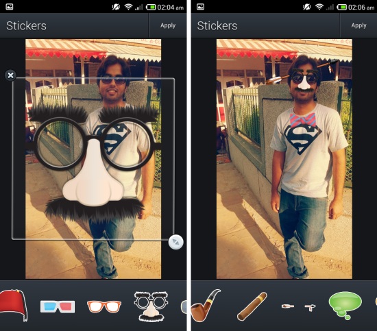 Photo editor pro provides quite a bit of stickers. Stickers can be applied by tapping on the stickers and then adjusting them to a required location with the provided controls. You can add multiple stickers with ease on an image.
