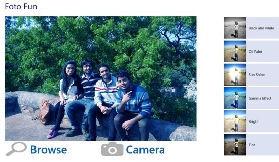 Photomatic is another free photo effect app for Windows 8 that allows you to apply various kinds of effects on images and modify and enhance photos according to your liking and needs. The interface of the app will be defined as simple, fast, fun, intuitive, and clutter free. This app comes with 20 amazing effects that let you modify and enhance your images according to your needs. Also the developers have stated that the future version of the app has even more and better effects. This photo effect app has the ability to add images for editing from files and camera. The best thing that I liked about this app is that when you add an image to it the app will preview all the effects that are available in the form of a film strip in the button part of the app window.