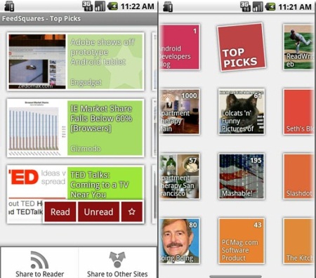 Feed Squares is bit different from other free RSS readers. Other applications of same lot gives you a boring list of RSS feeds, you have to go through the whole list to find out which one to pick and which one to drop. This free RSS reader for Android displays news feeds in colorful boxes, every color represent each category. Hence, looking at the color, you can prioritize the news articles. The interface is user-friendly, even a computer beginner can easily browse through it. If you have plenty of news feeds from a bunch of websites, this freebie is for you.
