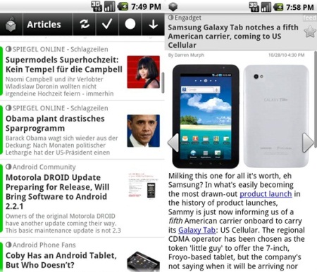 As the name says, being fast is the key feature of Fast RSS Reader for Android. Unlike other RSS readers, this application has two tabs, one tab shows each feed that you select and the other displays all the feeds. You can Zoom in or Zoom out the view as per your convenience and you can switch to different articles with ease. Search option is not available in this application and the user-interface is not so good-looking. This Free RSS reader, Fast Reader is an ordinary one that suits people who just want to read regular news.