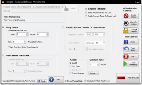 Romaco Timeout is a free parental control software that let’s you limit computer time. This free software basically allows you to set the time limit for computer usage, so your kids can use the computer according to the time limit specified by you in the software. This parental control software is also capable enough to block the web browser usage, block websites, and block other computer programs unsuitable for kids. This timer software even allows you to restrict the number of hours in a day to use computer. If your kids are spending more time on computers, rather than playing or doing any other activity, then it’s worth trying out this software to impose limit on computer usage.