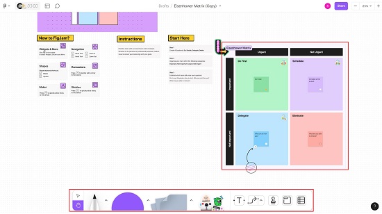 Like FigJam, you can use the tools provided in the toolbar towards the left of the Visual Paradigm workspace to add Text, Shapes, Freehand, Tables etc. to your matrix and plan and organize your tasks in each of the four Quadrants.