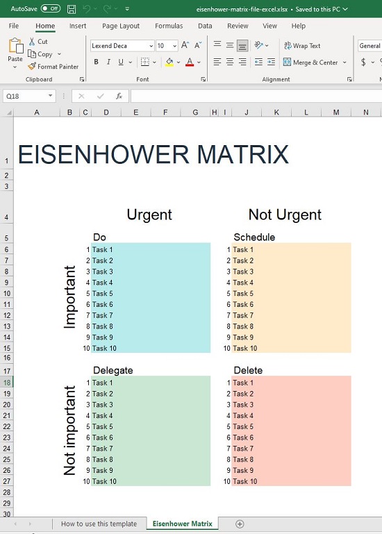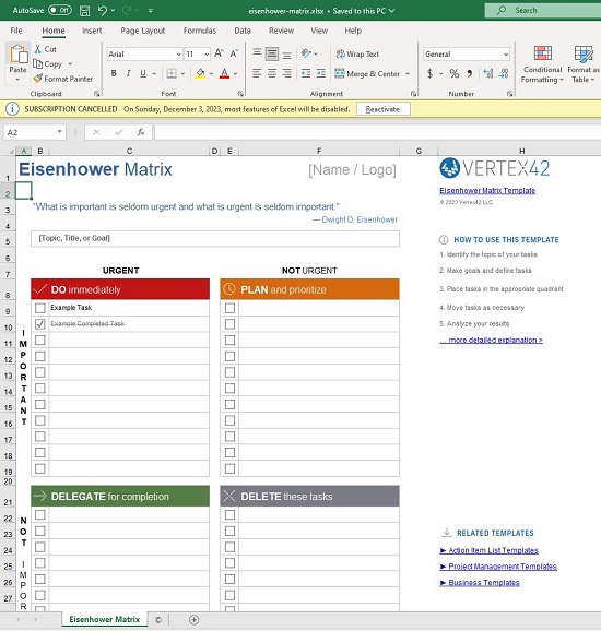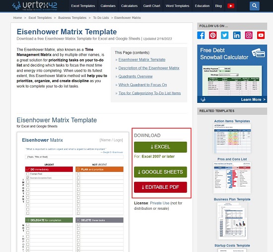 Since 2003, Vertex42 has been an extremely trusted source for very good quality Excel templates including a variety of planners, schedules, calendars, personal finance spreadsheets and more. Vertex 42 also boasts of an Eisenhower Matrix Template that you can download in Excel or Google Sheets format as well as an editable PDF file.