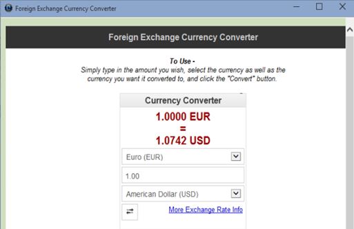 Foreign Exchange Currency Converter calculates conversion of two currency pairs, as you can see from the image above.