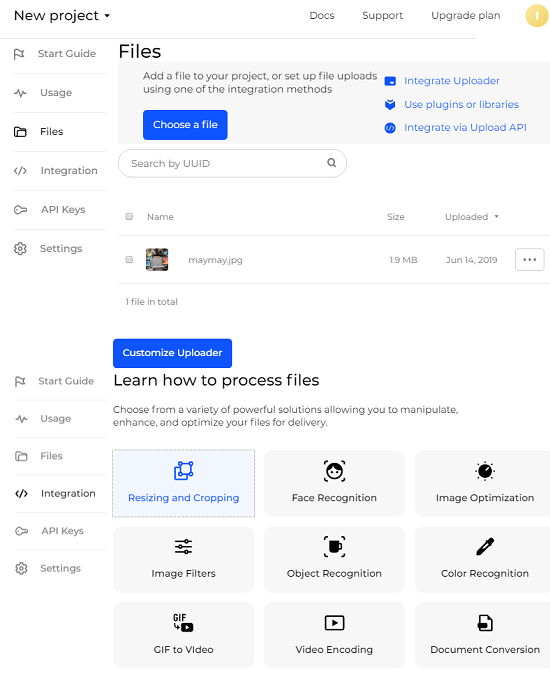 After you sign up, you can start upload the image and it will give you a unique URL for each image you upload. You upload images, you will have to learn how the resize and other operations works. it serves all the images over HTTPS and to use the dynamic operations, you can see them all listed here. One of the best features of Uploadcare is that it offers you an API as well that you can use. And in the integration section, you will find some advanced tools for image processing.