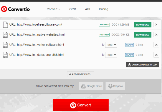 Convertio is one of the best online options to convert webpage to Word. It lets you generate DOC as well as DOCX format files from input webpage URLs. The best part is you can add multiple URLs and it will convert first two URLs to DOC and DOCX format files and so on. Another good thing is you can set separate output formats for input URLs. For one URL, you can set DOC format and DOCX format for another URL.