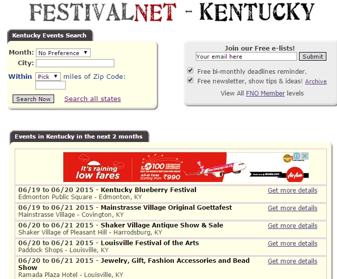 The final website to find events online reviewed here is FestivalsNet.com. Although a little archaic in its interface, this is a good platform to find various events mainly focusing on art & craft, children, family. On the home page, you will find both the options to find and event, or list your own event. You can choose to find events by location, distance, or genre. The website claims to list over 26,000 events including events like home & garden events, musical event, art & craft events, and more. While you are searching for the events, there are broad categories like events with & without music, juried events to choose from. It covers events for all the states in US and there are also separate state pages for all these states; these pages list popular events taking place in a particular region of the country. Lastly, there is also an option to submit your email to receive reminders and newsletters from the website. Check it out from above.
