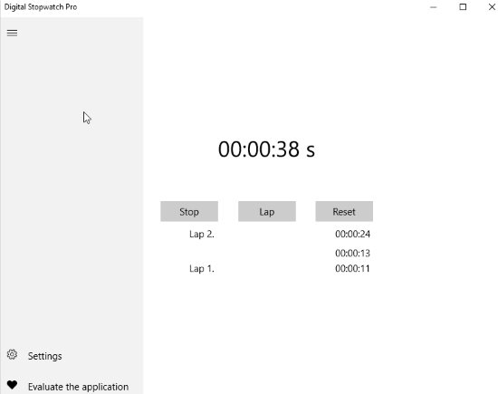 Digital Stopwatch Pro is a free stopwatch for Windows 10. In this app you will land on the interface shown in the screenshot above when you start the app. Click the start button to start the stopwatch to record your activity time. The lap button will let you record your activity lap time if you are doing a repetitive activity. The settings option provides you recording of time in nano seconds and mili seconds, but these options are available with the paid version of the app.
