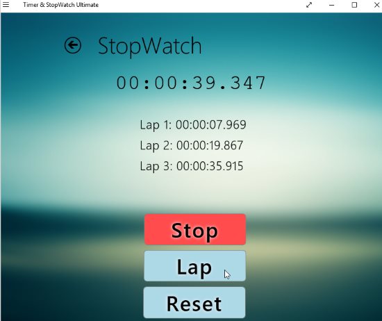 Stopwatch: StopNow Free is a Windows 10 app which also comes with a timer. When you start the app you will get options to choose between stopwatch and timer. As we are discussing stopwatch in this article, so we will choose the stopwatch option. On clicking the stopwatch option you will get an interface like the one shown in the screenshot above. When you are ready to time a activity, click on the start button and the stopwatch will start. Press the stop button as soon as the activity is done and the stopwatch will tell you the accurate time it took you to complete the activity. If you are doing a activity or exercise which involves laps in it, then start the stopwatch and when you complete a lap, press the lap button. This lap button will make the stopwatch start over again from zero. The settings option in the app lets you change theme of the app, and the language of the app. Apart from this you can disable lockscreen while this app is running.