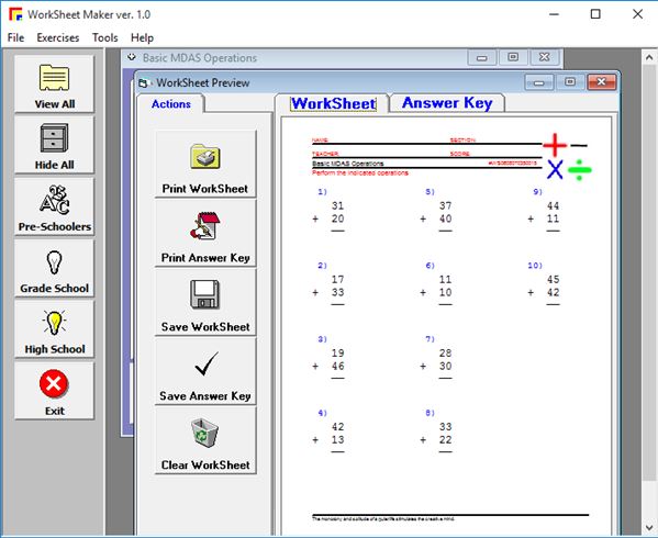 iKodeko Worksheet Maker is an advanced worksheet generator software for Windows 10. It can be used to create worksheets for pre-schoolers, grade school students and high school students. Use the left sidebar in the main application window to choose for which of the three available levels of education you need the worksheets for.