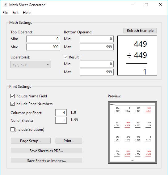 How the worksheet is going to look like is highly customizable, as well as the math problems themselves. Number of problems per page, and the number of pages that are going to be generated can be controlled using the “Print” settings” area at the bottom of the application window. “Math settings” section holds options for configuring how high the numbers will go in the generated math problems, and which algebra operations are going to be used. “Refresh Example” button in the top right corner is going to change the worksheet preview in the bottom right corner. When done, worksheet can be printed directly via printer, or saved as either PDF document or images.