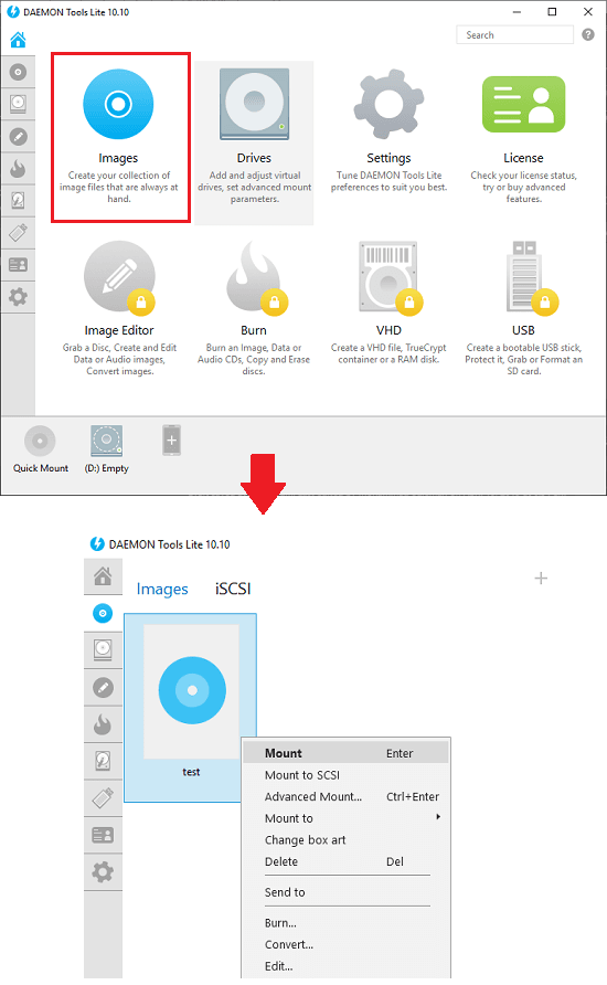 You can simply go to homepage of this software using above link and then download it from there. After installing it select the “Images” option from its main interface. After that, right-click in empty area to select “Add Image” option and then simply add the NRG file you’d like to mount. After you have imported the image, right-click on it and then select “Mount” option and it will immediately mount that. That is it.