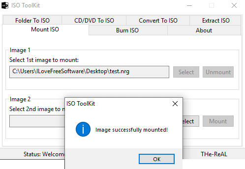 ISO Toolkit has depreciated but still works just fine in Windows 10. This tool is primarily meant to deal with disk images having file extensions NRG, ISO, and BIN. With this software, you can convert any CD/Folder to ISO or mount it. If you have working CD/DVD writer in your PC then you can burn it as an image to CD/DVD as well. It has a simple interface where you can find all the modules that has. Using one of those modules, you can easily mount an NRG file in Windows. In just 2 click, it can mount any NRG file as a drive in Windows.
