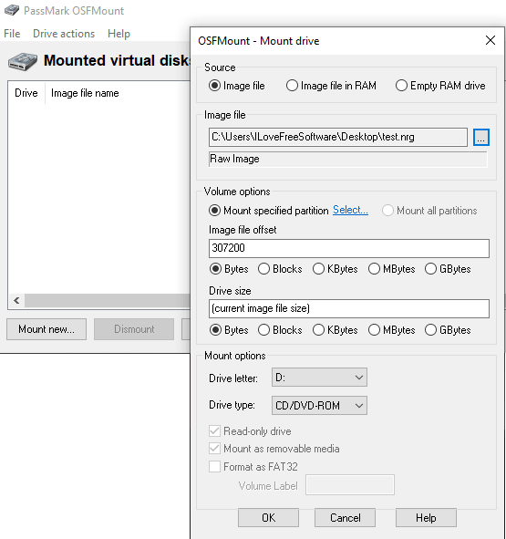 Passmark OSFMount is one of the best free NRG mounter software out there to mount NRG files in Windows. Aside from NRG, it supports other disc images such as IMG, VMDK, Bin, IMG, etc., for mounting them as virtual drive. It comes with a simple interface and after specifying the target NRG file, you can mount it in one click. It gives so many options to opt for while mounting a disk image file.