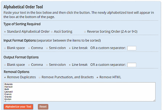 Text Fixer is another free website where you can find various useful tools for text files. With its Alphabetical Order tool, you can easily sort any type of list in alphabetical order. To do that, simply paste your list here and select the item-separator in the Input Format Options. Then select the Standard Alphabetical Order in the sorting-type and click the “Alphabetize you text” button to sort the list. By default, the output list has the same item separator as the initial list but you can change it if you want. You can also remove duplicates, punctuation, brackets and HTML content from your final sorted list.