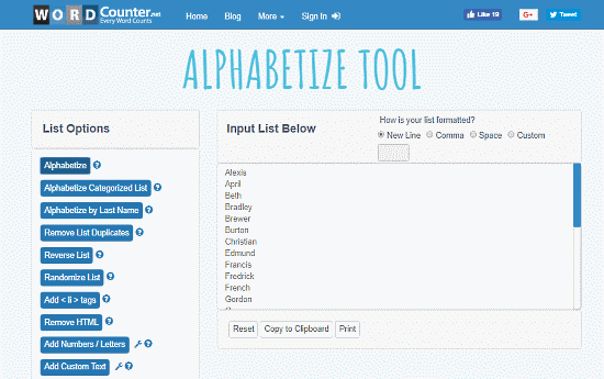 The next alphabetical order sorter website on this list is Word Counter. This website has a free “Alphabetize Tool” that help you sort lists in alphabetical order. To do that, paste your list in the text box and select the item separator you use in the list. I separated the items in my list with a line, so I selected the “New Line” option as the separator. This way, you can easily sort your list and copy it to the clipboard. You can also print the resulted list directly from here.