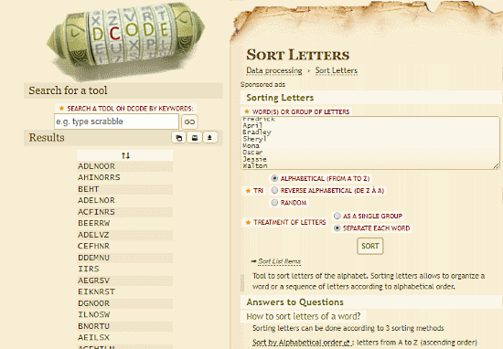 Dcode is a free website that offers various types of text related tools. Under its Data Processing toolkit, there is a list sorting tool named “Sort Letters“. With this tool, you can easily sort a list in alphabetical order in a matter of seconds. Simply paste your list here and select the “Alphabetical (From A to Z)” option. Here, you also get an option to combine the output list items in a single group or separate them apart in new lines. After selecting both these options, click the “Sort” button to sort the list accordingly. It displays the sorted list on the left-side tab from where you can copy, print or downloads it.