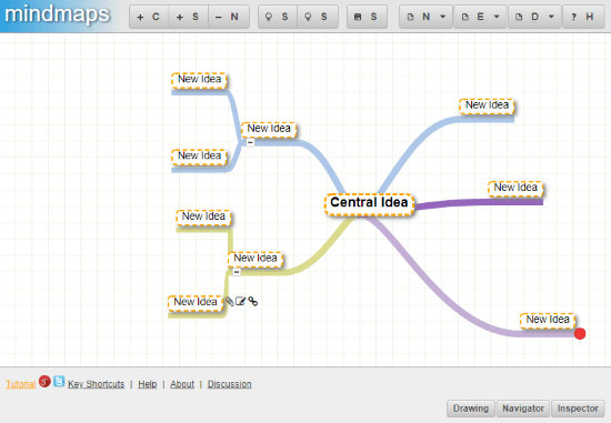 MindMapMaker is a free online mind map editor where you can easily make concept maps. This editor is very straightforward and simple to use and does not require login or signup. It has a large canvas area for the map with a toolbar at the top. When you open this editor, it already has the main concept(root node) on the canvas. This central node has a red point on it which you can click and drag to add child nodes. You can also add nodes from the toolbar at the top. The toolbar contains quick shortcuts to add/remove child and sibling nodes.