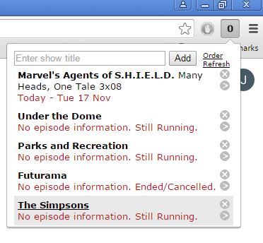 Icon of the extension is basically a notification counter which shows you the number of days until the next episode of one of the shows that you keep track is going to be aired. Extension is very clean and simple. Use the input field at the top to look up and add shows to the list.