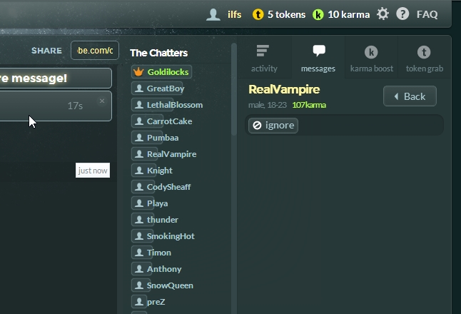 One interesting thing to remember here is that you need to have enough token and points to chat to a particular user. Every user has a particular sum of tokens & points that keep on increasing. If you wish to talk to them, you need to posses the same amount of tokens. Only users with same tokens & points can talk to each other. Don’t worry, there are enough activities to help you earn more and more tokens.
