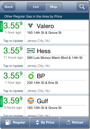Since, gas is the fist thing that should be in plenty if you want to have a good ride so I am starting this list of iPhone apps for cars with GasBuddy – Find Cheap Gas Prices. As the name suggests, this app finds the cheapest available gas prices for your car so that you can save those bucks for your next ride. The app lets you search for cheap gas prices by using either your location via GPS or by entering the city name/ZIP code. The app displays the gas station name, address, payment mode (cash/credit), gas price including the last updated time. You can filter the search results on the basis of Regular, Midgrade, Premium, and Diesel fuel type along with sorting them on the basis of either price or distance.