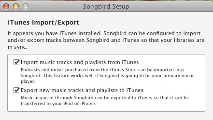 To open the application just find it in the application folder and click on it. SongBird will open with a licence agreement. Agree with it, after this it will ask you if you want to import and export from iTunes. Do enable them if you would like to do so.