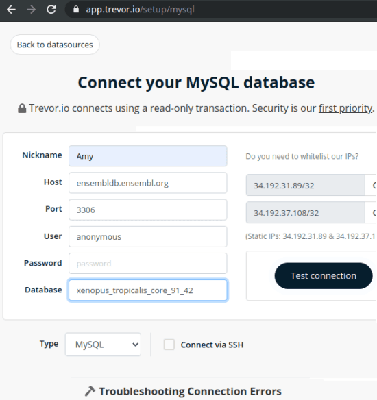 Trevor lets you create a database diagram online from existing databases for free. Here it lets you connect to a variety of databases and then you pull its schema and draw a database map. The map is nothing but an ER diagram that you can edit and customize. It draws all the relationships there automatically and you can even share the database schema with others as well. It supports databases including MySQL, PostgreSQL, MongoDB, SQL Server, Snowflake, MariaDB, Redshift, and few others. You just connect to any database and then simply pull the schema as a diagram that you can share with anyone you want.