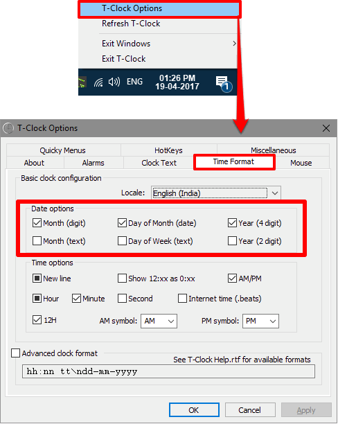 Step 2: The clock which is added to your PC shows time and date collectively. But, you can customize this and remove the date and other time parameters from the clock. To do this, right-click on the clock and then click on T-Clock Options. Next, move to the Time format tab and there you can disable any options that you don’t want to see, like, year, date, day, etc. If you remove the date part, you will have only clock left in the Taskbar.