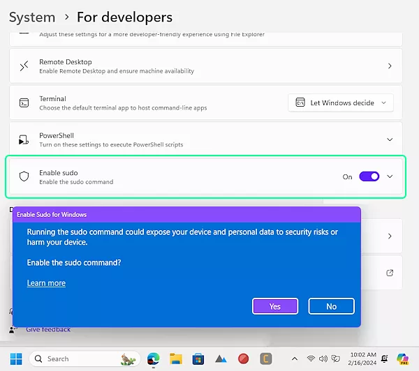 To do that, launch the “Settings” app on Windows 11 and pick the “System” settings from the navigation panel. Scroll down to the “For developers” settings and click it open. Look for the “Enable sudo” setting there and click on it to enable. This shows a popup on the screen mentioning the potential harm of enabling sudo. Click Yes in the popup to enable the sudo command on your Windows 11.