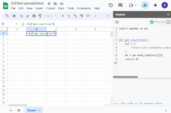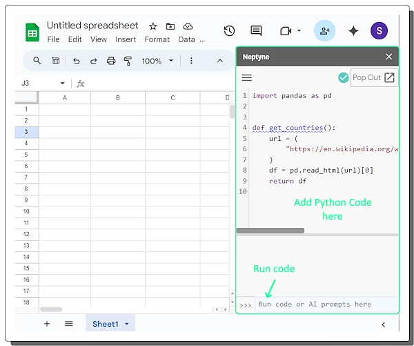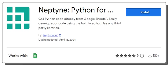 This post explains how to run Python in Google Sheets. Neptyne is a free extension that brings Python into Google Sheets. By installing this extension, I can get a dedicated Python code editor where I can write my own functions and use any third-party libraries. This extension extends the functionality of spreadsheet making it easy to import data from various sources using Python.