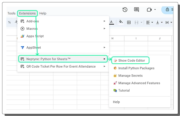 After the installation, I can access it from the Extension section on the ribbon menu of Google Sheets. It shows by the name Neptyne: Python for Sheets. Hovering the cursor over this shows all the possible actions this extension allows: