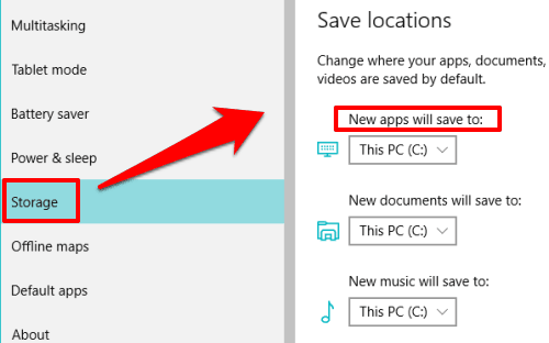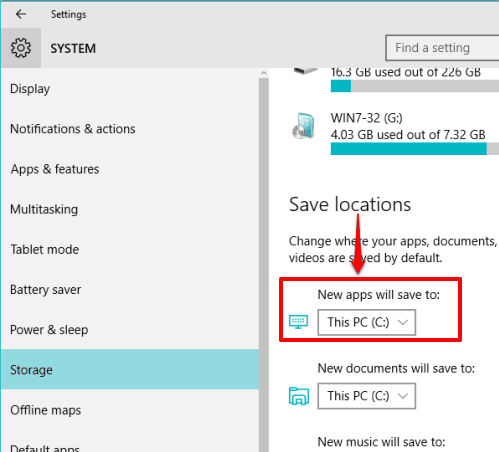 Step 2: In System section, you need to click on Storage option. After this, you will be able to see Save locations section. This section shows the default storage locations for apps, documents, music, etc.
