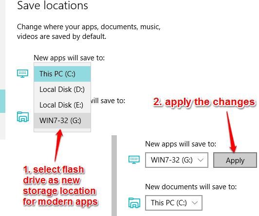 select flash drive as storage location and apply changes