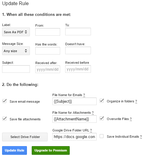 Note: In its free version, you can create just one rule to backup Gmail emails to Drive with attachments.