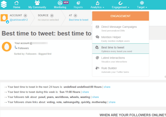 SocialBro (free plan) needs only two or three mouse clicks to generate report for finding the best time to tweet. Report is based on 100 followers, but detailed information is provided in that report. Report will help to analyze your most suitable time for next 24 hours and for the week. Apart from this, you can also find what your followers mostly talk about (tags or keywords) and what kind of links they follow the most.