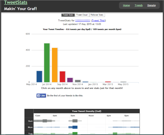 TweetStats is handy to generate beautiful graphs about various factors. It can automatically plot graphs to show you total retweets, replies, number of retweets, your tweet density, aggregate daily and monthly tweets, etc. Apart from this, it also shows your TweetCloud to see your top five words and other words that got more mentions. Moreover, option to check Follower Stats is also available to explore details about your followers. All these features can help you find if you were using the impressive words or tweeting on the good time or not.