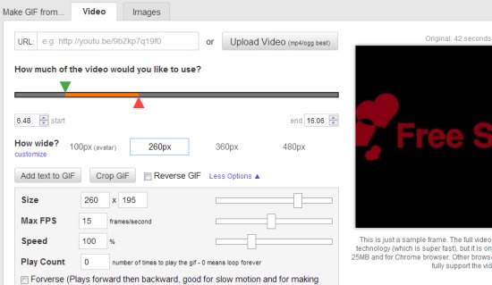 Video Option: Use this option to extract a part of video file as animated gif. You can upload an online video or video from PC. Once the video has been uploaded, you can select the start and end part of video segments, width for output animation (not more than 360 px), and can hit the same generate GIF button to get the output. If you want, you can even add text for output as watermark, can adjust Maximum FPS, speed, and loops (number of repetitions) for output animated gif.