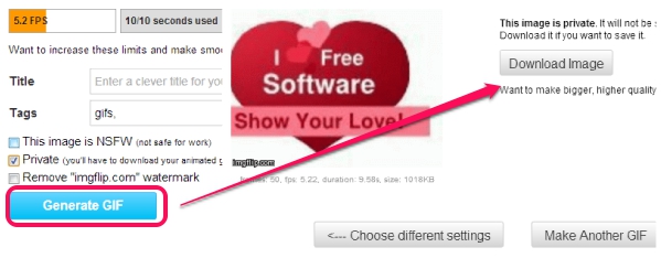 Change settings according to your requirement. Now you can either download the output to PC or can auto upload it on imgflip.com, and can share with friends. If you don’t want to share animation with anyone, then enable Private option and hit on Generate GIF button to download it.