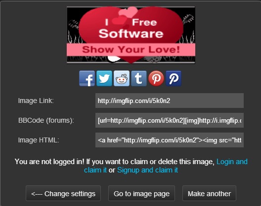 After generating the gif, you can either download it to PC, upload it online on imgflip.com, or can share it on Facebook, Twitter, Reddit, Tumblr, Pinterest, etc. according to your requirement.