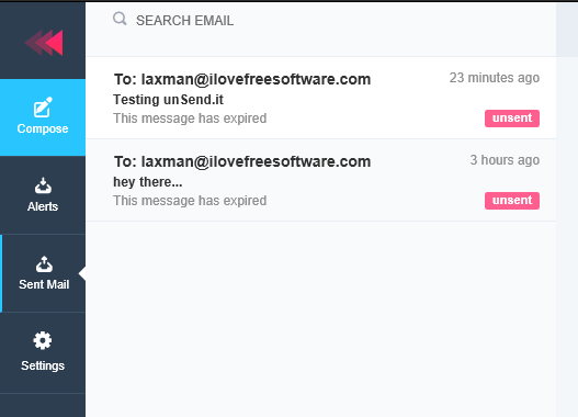 Step 4: When your account is configured, you will come to the main interface of unSend.it. The Left side contains different sections: Compose, Alerts, Sent Mail, and Settings.