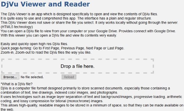 DjVu Viewer and Reader is a nice DjVu file viewer website. When you land on this website using the given link, you will see an interface like the one given in the screenshot above. You can read a brief about DjVu files and what they are. In between all this text you will see a box which says drop a file here. So you can either drag & drop a file in the box or choose the browse option given below the box to search for a file. As soon as you select a file the interface will change to open the DjVu file in it.