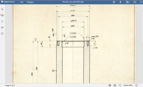 OnlyOffice is an online office suite which includes text editors, presentations, spreadsheets, and viewers. You would be required to create an account and sign in to the website. The website is free for personal use. You can use your Google, Facebook, etc. accounts to sign in as well. Once you sign in, you will see an interface like the one shown above. On this page click the upload button right next to the create button on top left side. Now upload the DjVu format file. Once uploaded it will appear on the right side list of documents. Click on the file name to open it.
