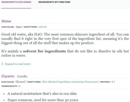 Below this section is the list of ingredients explained in detail. The list is divided into two tabs one is ingredients explained and the second tab is ingredients by function. The screenshot below displays this ingredients tabs.