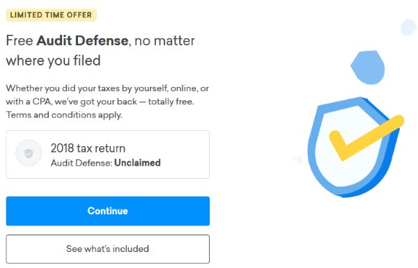 Then you will get to the page which looks like the above screenshot. The free audit defense service is a limited time offer and is completely free. You can sign up for this service even if you used a CPA to file your taxes, or you filed your taxes online. Check out “see what is included” button to see what all is included in the audit defense service. Once you are sure go ahead and click the continue button.