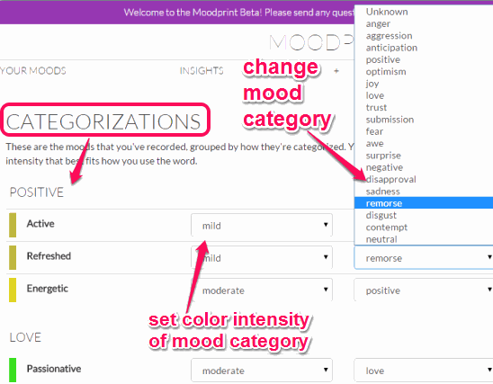 • You can manually change mood category for each mood and can also set intensity of color (mild, moderate, and intense.).