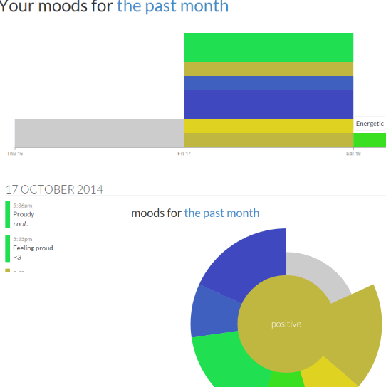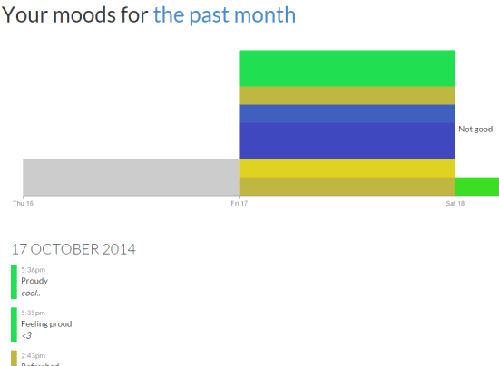 In screenshot below, you can see timeline of my moods with different bars. With each mood, you can also add extra comments, and those comments will be visible to you at bottom part.